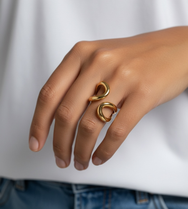 La forma morbida e sinuosa abbraccia il dito con eleganza, diventando un pezzo distintivo ma facile da indossare ogni giorno. Perfetto sia da solo come elemento protagonista, sia abbinato ad altri anelli per un look più deciso.