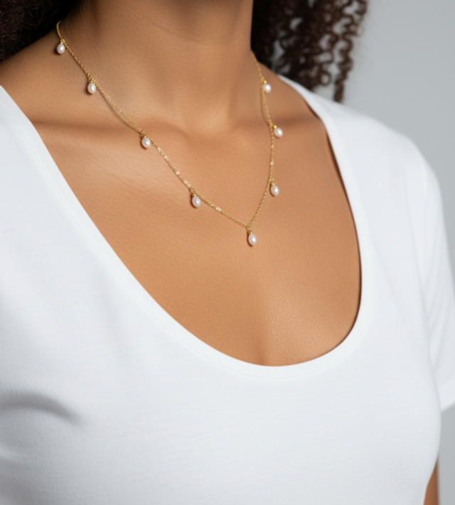 La Collana Perle Luminose è realizzata in acciaio al titanio, un materiale leggero, resistente all’acqua e anallergico, impreziosito da piccole perle d’acqua dolce che scendono lungo la catena con movimento naturale.