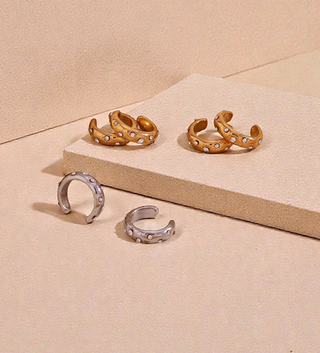 Realizzato in acciaio al titanio, è leggero, anallergico e resistente all’acqua, perfetto per aggiungere luminosità ai look quotidiani o per completare outfit più raffinati. Disponibile in versione argento o dorata, si abbina facilmente ad altri orecchini e earcuff, creando combinazioni uniche.