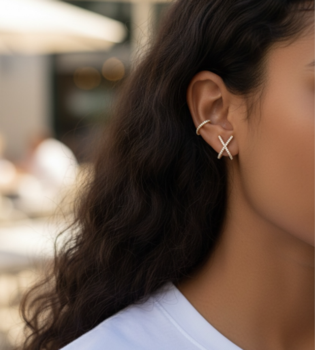 Gli Orecchini Xé sono realizzati in acciaio inossidabile e impreziositi da un pavé di zirconi brillanti che catturano la luce a ogni movimento. Il loro design incrociato, minimal ma d’impatto, è completato da una parte leggermente curvata che abbraccia delicatamente il lobo, creando un effetto elegante e avvolgente.