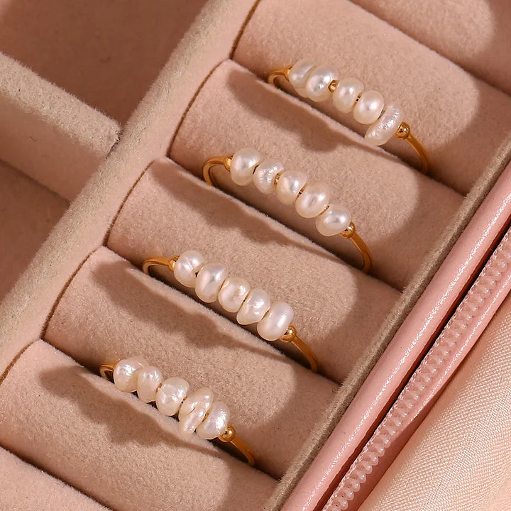 Realizzato in acciaio al titanio galvanizzato oro 18K, è resistente, leggero e perfetto per l’uso quotidiano senza perdere brillantezza. Le perle aggiungono un tocco elegante e romantico, ideale sia da solo che abbinato ad altri anelli sottili.